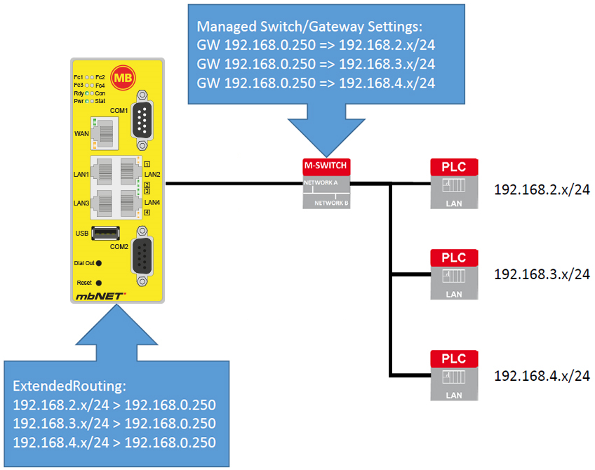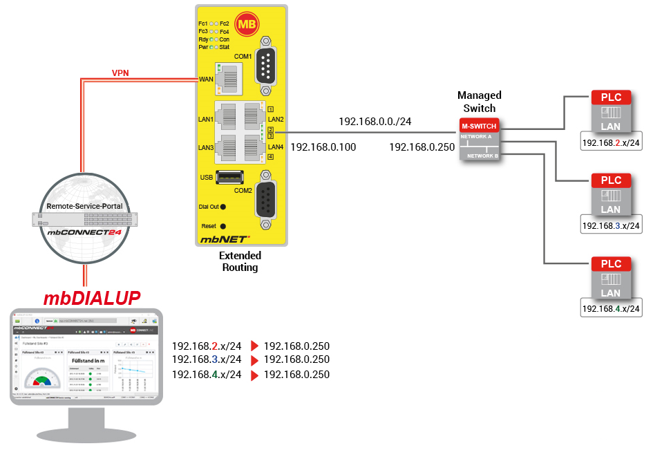 The machine networks are becoming more and more complex and segmented. The remote maintenance has so far been limited to only one network segment at the LAN interface. The ExtendedRouting function now offers the possibility to reach different networks via additional routers that are connected to the LAN interface. I.e. if there‘s already a Managed Switch with routing function in the facility, its network segments can be entered in the mbNET and the remote maintenance therefore knows which network segment can be reached over which Managed Switch/Router.
