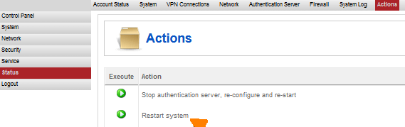 - Finally, the system must be restarted under // Status / Actions [Restart system]: