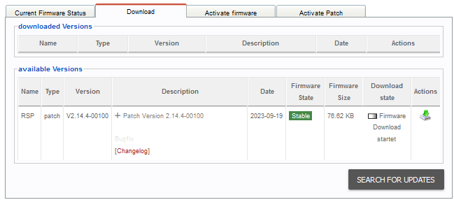 - In the [Download] tab, you can search for new versions and download them. A distinction is made between patch and firmware: