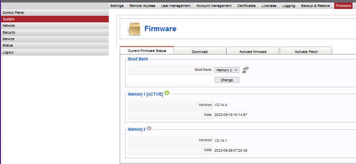 - Check under [Current Firmware Status] that the other boot bank is now activated. Correct the setting if necessary.