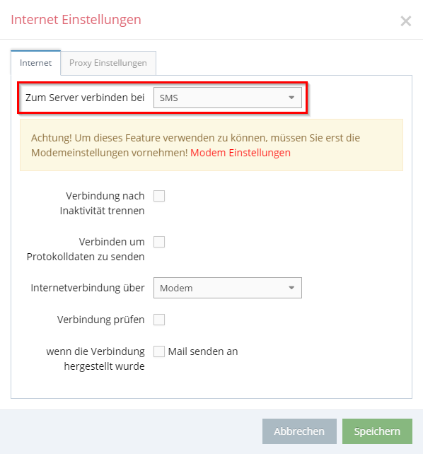 Wenn Sie möchten, dass Ihr mbNET bei Bedarf startet (z.B. via SMS) müssen Sie dies in der Geräte "Verwaltung" unter "Internet" -> "Zum Server verbinden bei" einstellen: