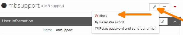 Um den Supportuser nach der Analyse wieder zu sperren, muss dieser nicht gelöscht werden. Sie können ihn über das Schlüsselsymbol in der Benutzerverwaltung und die Anweisung Blockieren (de) / Block (en) vorübergehend sperren. Bei Bedarf kann er dann wieder einfach aktiviert werden.