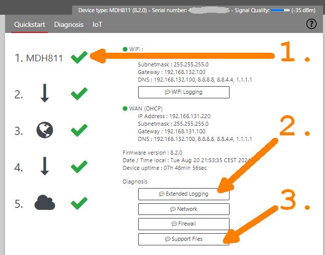- Um uns die Protokolle des Routers zukommen zu lassen, klicken Sie bitte auf Support Daten (de) / Support Files (en) der Router bietet Ihnen eine entsprechend benannte Datei zum Download an. Diese Datei enthält in verschlüsselter Form die wichtigsten Protokolle und aktuellen Parameter des Gerätes.